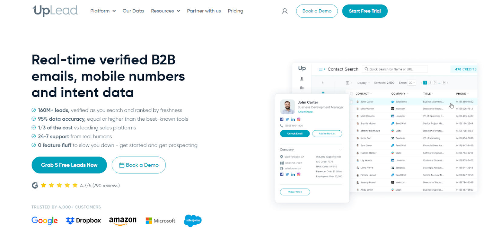 If your focus is on needing verified data and real-time email validation, you’d find both of those features satisfactory with Uplead. Uplead offers a guarantee that every lead in the database is checked before export, which means you’ll end up with fewer bounce issues and less of your time spent cleaning up your lists. If you work for an agency in a GDPR or CCPA compliance-heavy industry, this can be vital. Consider it a quality-over-quantity type of tool.