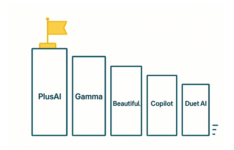 A: PlusAI took the crown in total turnaround—under five minutes from prompt to polished deck, largely because it works inside PowerPoint, avoiding export or formatting delays.