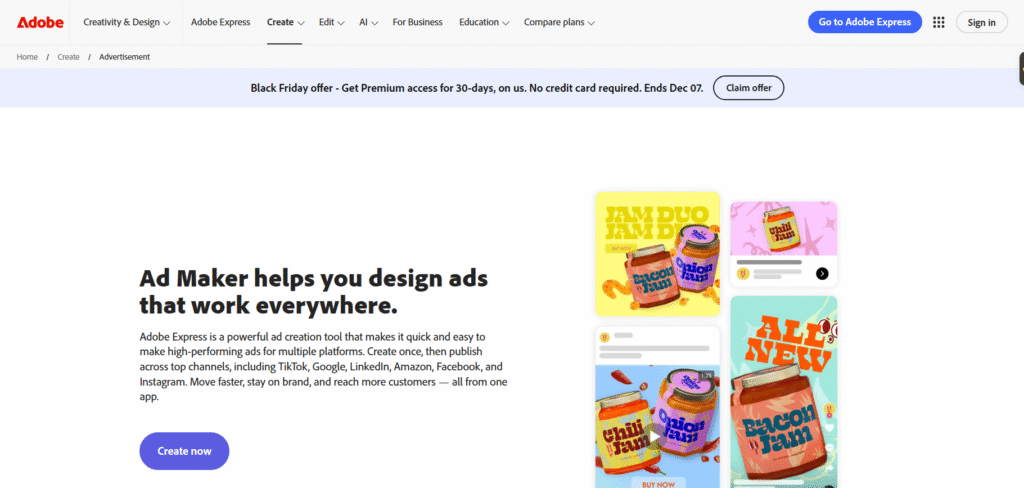 Adobe Express is one of the most versatile tools for creating ads in 2026. It combines the power of Adobe’s design ecosystem with a simple interface that anyone can use, even without design skills. The platform is built for speed, making it ideal for businesses that need to publish ads across multiple channels on short timelines.