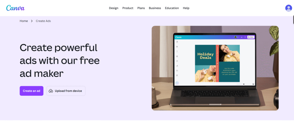 Canva is one of the most widely used platforms for creating ads, especially for social media. Its simple editor, rich asset library, and ready-to-use templates make it a favourite for small teams and marketers who need fast, high-quality visuals.