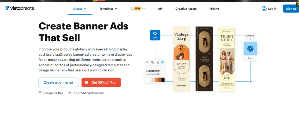 VistaCreate is a strong alternative to Canva, offering a smooth editing experience with a library of animated templates, static designs and ready-made ad formats. It is especially helpful for businesses that want more motion-based creatives without learning advanced animation tools.