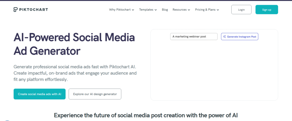 Piktochart is a visual content tool used for infographics and presentations, but it also works well for static ads. Businesses use it to design clean layouts and information-driven visuals.