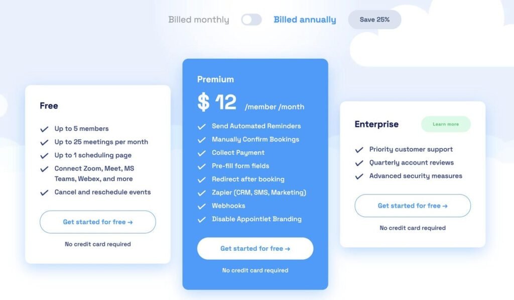 Appointlet’s premium plan is billed monthly per seat.