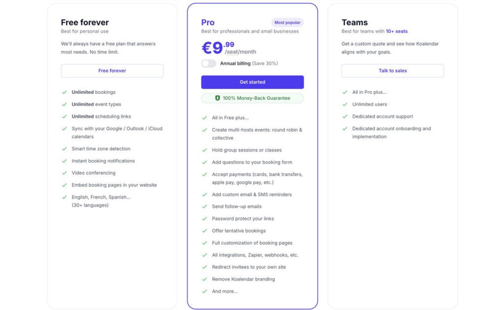 The biggest differentiator is the free-forever plan. Unlike many scheduling apps, Koalendar offers: