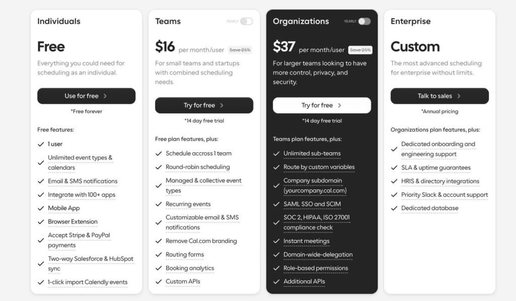 | Team features | Round robin, collective bookings, group sessions on | Collaborative features on premium plans | Team collaboration tools | Team scheduling | Team scheduling available |