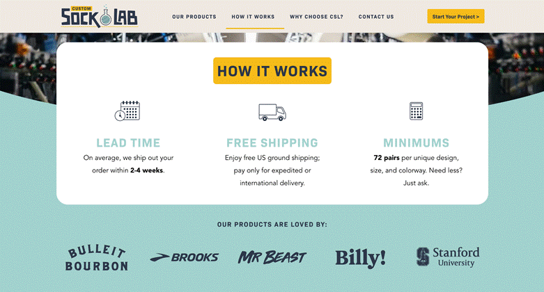 Visuals, for example, are an amazing content type for boosting conversions because they’re (often) attractive and they help message comprehension. Additionally, they can help simplify text content and even boost readability by visually separating different concepts or benefits, which is precisely what Custom Sock Lab does on its How It Works page.