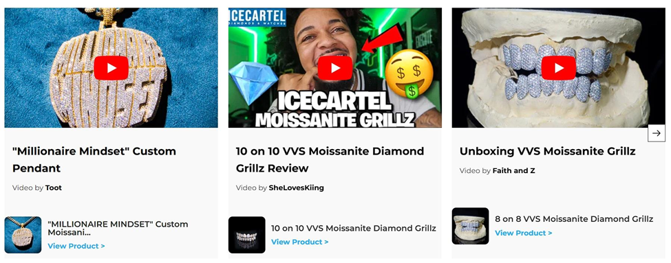 Icecartel, a men‘s Moissanite jewelry brand, does this effectively. On their website, they display content that customers and influencers post on social media featuring their products.