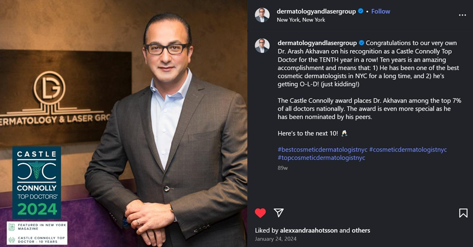The Dermatology and Laser Group, a cosmetic dermatology clinic in New York City, executes this well. They prominently showcase their founder and management team across their website and social channels.