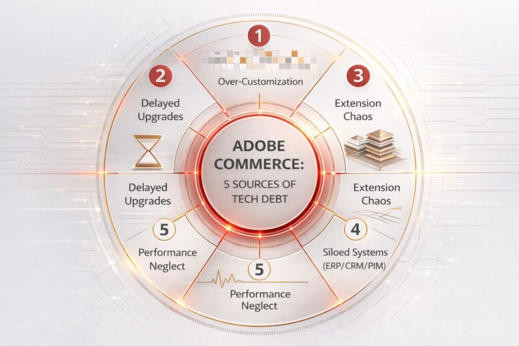It calls attention to short-term band-aids like quick customisations, unmanaged extensions, postponed upgrades, and schizoid integrations on Adobe Commerce.