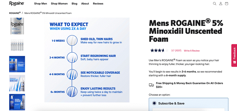 For example, check out how Rogaine does it below. The brand uses a combination of copy and visuals to explain how its solutions work. It provides detailed use instructions and even gives shoppers a transparent “what to expect” section. This boosts purchase intent via the mediating influence of product understanding and helps the brand inspire more conversions.