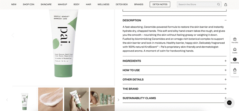 For inspiration, check out how The Detox Market does it with its hand cream product page. Knowing how important product texture and feel are to its target audience, this brand smartly includes a close-up of its lotion to make it easier for shoppers to assess what this product feels like and whether that aligns with their wants and needs.