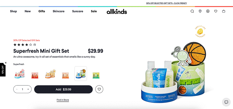 The 10% off pop-up button on the Allkinds website is a great conversion incentive, even though it doesn’t necessarily boost sales right away. Nevertheless, it works by convincing web visitors to sign up for the brand’s newsletter. That’s equally as valuable — especially as it allows the business to nurture high-value leads into satisfied (and eventually loyal) customers.