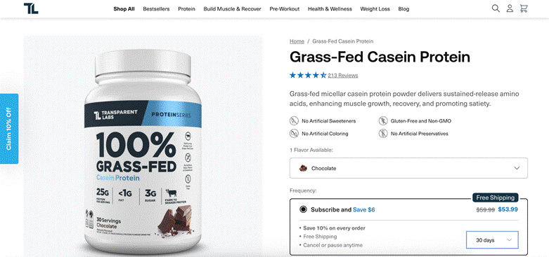 So, if you sell consumable products, adding a subscription incentive — like the one on the Transparent Labs Grass-Fed Casein Protein product page — is a great tactic. This brand, in particular, tries to convince consumers to subscribe by offering a few valuable perks. The most obvious of these is the discount that return customers get. The brand also throws in free shipping for repeat purchases. Plus, it gives buyers control over how often they receive their products, with three possible delivery frequency options and the ability to pause or cancel at any time.