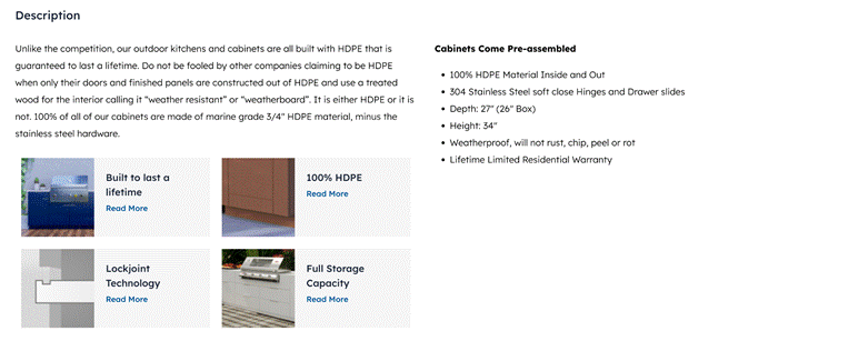 EXT does this on their 10 Foot Outdoor Kitchen page, knowing that most people don’t know about things like HDPE and LockJoint technology. So, instead of letting them leave without converting, the business does its best to make these concepts easy to understand with dedicated educational resources.