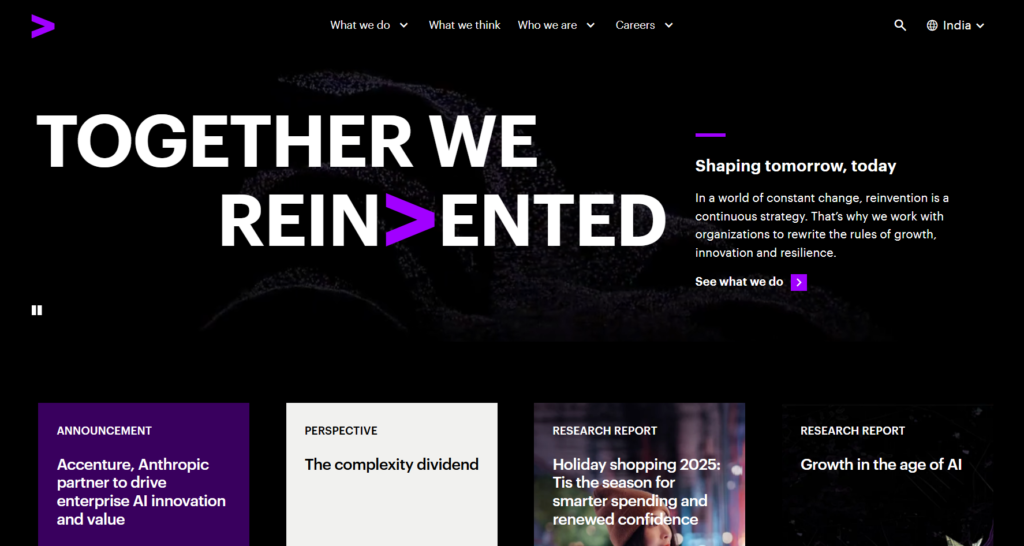 With deep expertise across banking, healthcare, retail, manufacturing, energy, public sector, telecommunications, and consumer goods, Accenture combines end-to-end capabilities with strong ecosystem partnerships to ensure organizations remain competitive.